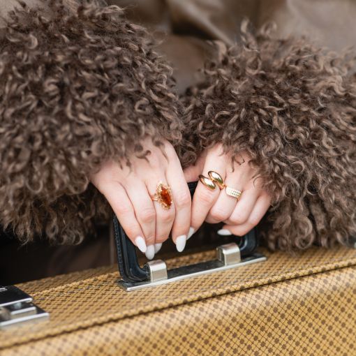 Ring, Ohrringe und Anhänger bilden einen harmonischen Look mit Vintage-Charme und warmem edlem Glanz.