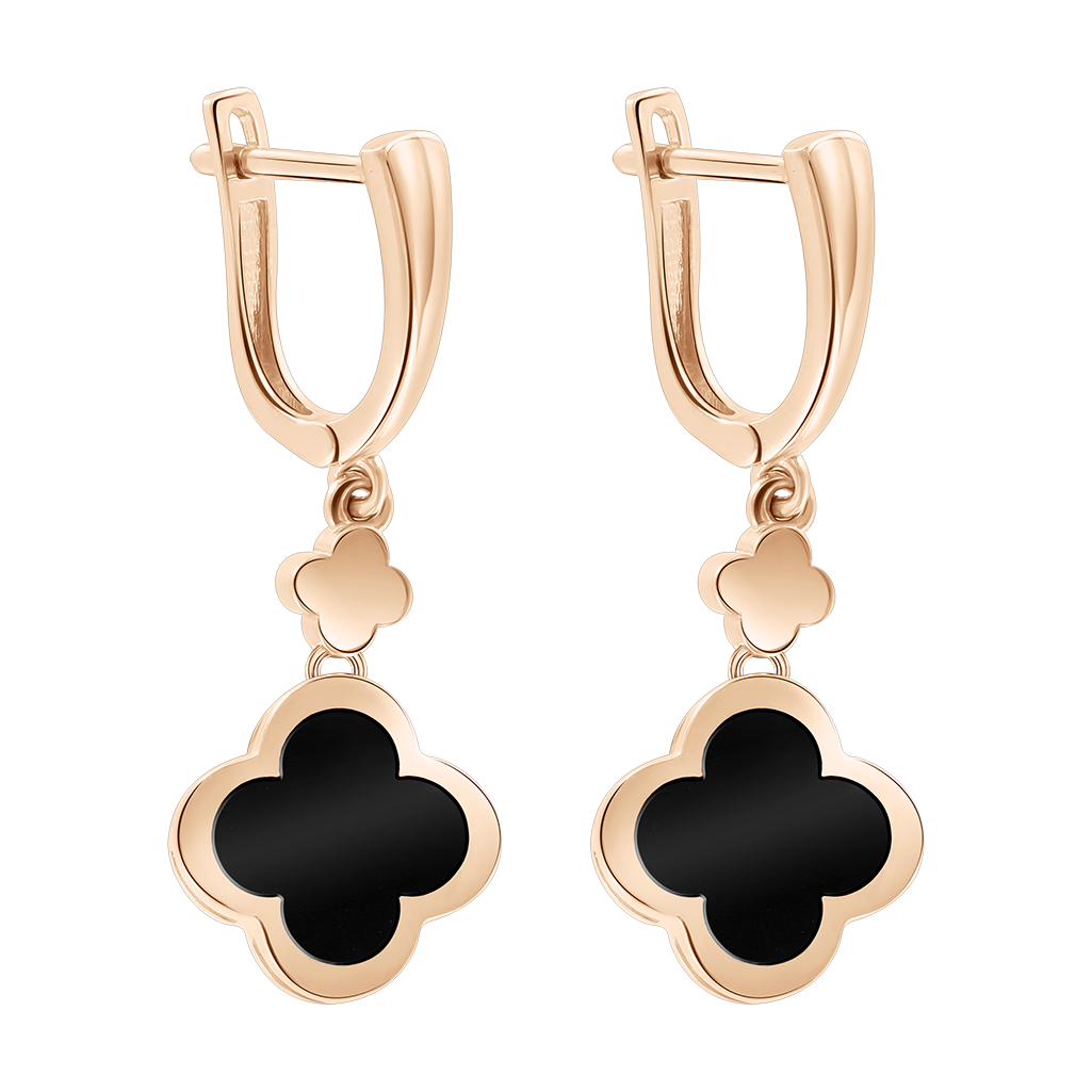 Elegante Ohrringe aus Rotgold 585 mit beweglichen Kleeblatt-Elementen, veredelt mit glatter schwarzer Juwelenemaille.