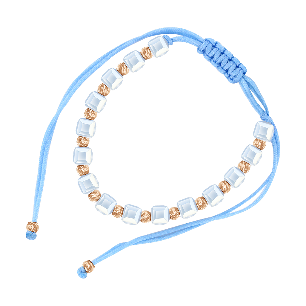 Armband mit blauem Faden, russischem Rotgold 585 und glänzendem synthetischem Glas.