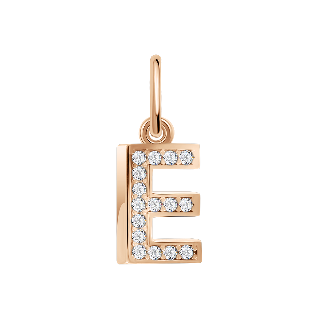 Ein stilvoller Anhänger in Form des Buchstabens „E“, gefertigt aus feinem russischem Rotgold 585 und besetzt mit funkelnden Zirkonia.