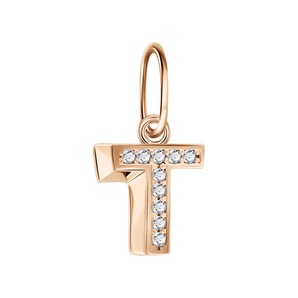 Ein edler Anhänger in Form des Buchstabens „T“, gefertigt aus feinem russischem Rotgold 585 und besetzt mit funkelnden Zirkonia.