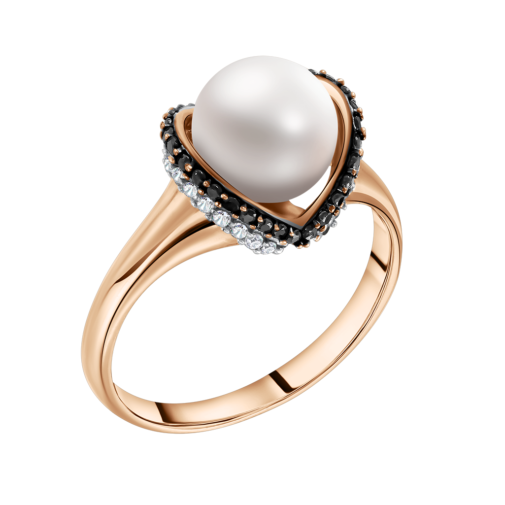 Ein prachtvoller Damenring aus russischem Rotgold 585, der den sanften Glanz einer Perle mit dem kontrastreichen Funkeln weißer und schwarzer Zirkonia verbindet.