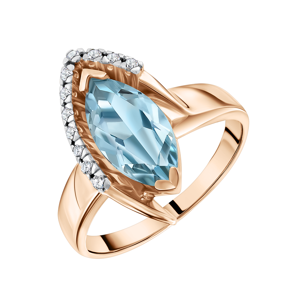 Ein bezaubernder Damenring aus russischem Rotgold 585, besetzt mit einem länglichen blauen Topas - ca. 13x6 mm und funkelnden Zirkonia.