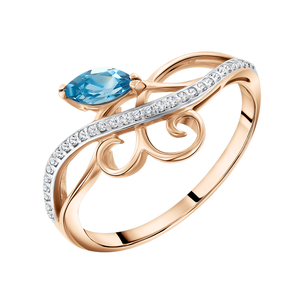Ein zarter Damenring aus russischem Rotgold 585, besetzt mit einem ovalen blauen Topas - ca. 6x3 mm und funkelnden Zirkonia.