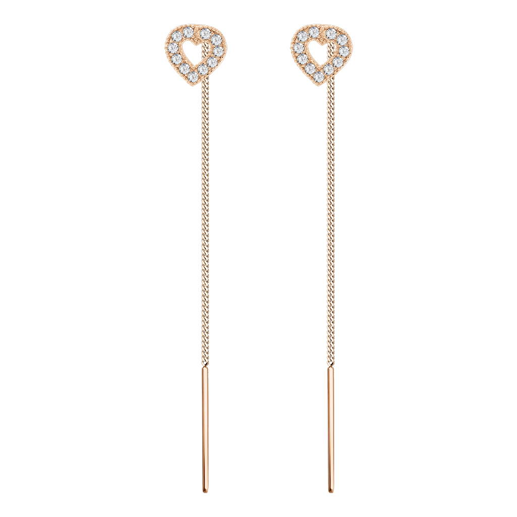 Feine, elegante Durchzieher-Ohrringe aus russischem Rotgold 585 mit kleinen, funkelnden Herzmotiven, besetzt mit Zirkonia-Steinen.