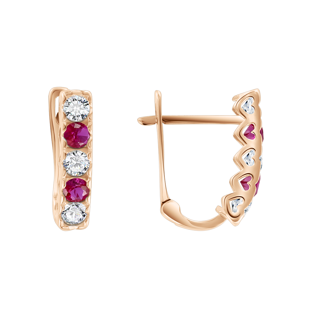 Zarte und edle Ohrringe aus russischem Rotgold 585, besetzt mit klaren und rubinroten Zirkonia-Steinen.