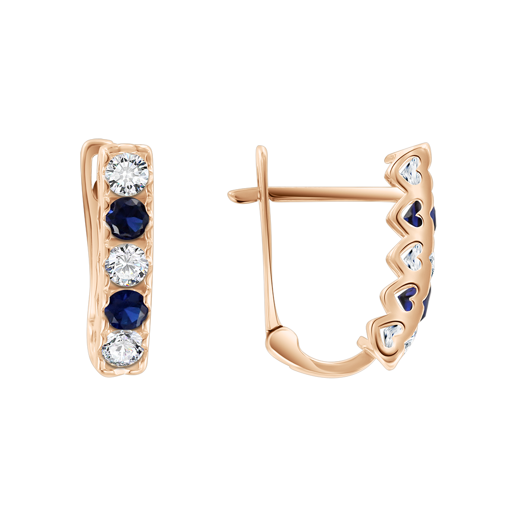 Feine und elegante Ohrringe aus russischem Rotgold 585, besetzt mit klaren und tiefblauen Zirkonia-Steinen.
