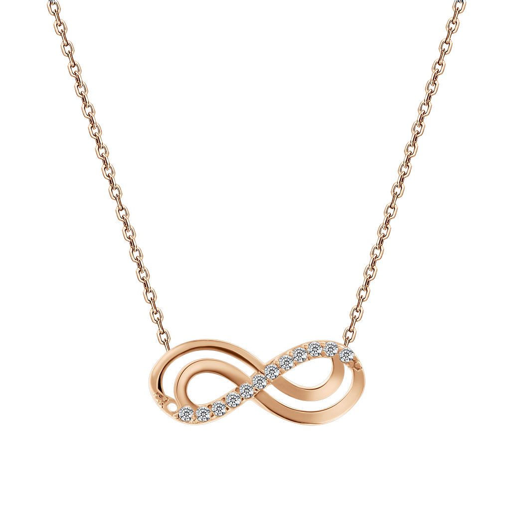 Zartes Collier aus Rotgold mit Anhänger in Unendlichkeitsform, verziert mit funkelnden Zirkonia. Ein Symbol für Liebe, Harmonie und ewige Verbundenheit in eleganter Ausführung.