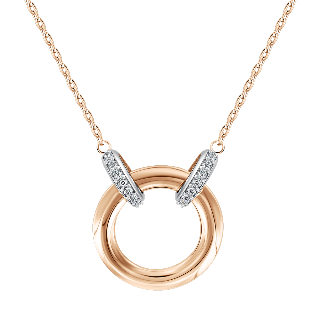 Stilvolle Halskette mit Anhänger aus russischem Rotgold 585 – ein Schmuckstück, das Eleganz und modernen Geschmack perfekt vereint. Die Kettenlänge ist verstellbar (ca. 44–49 cm) und sorgt für hohen Tragekomfort. Der Anhänger in Form eines Rings (Durchmesser ca. 15 mm) begeistert durch die harmonische Kombination von warm glänzendem Rotgold und funkelnden Zirkonia. Besondere Akzente setzen die dekorativen Elemente aus Weißgold, die mit Zirkonia besetzt sind und dem Anhänger einen raffinierten, modernen Charakter verleihen. Das klare, elegante Design macht die Kette zu einem vielseitigen Begleiter für den Alltag ebenso wie für festliche Anlässe. Ein edles Geschenk für Frauen, die Minimalismus und subtile Schönheit zu schätzen wissen.