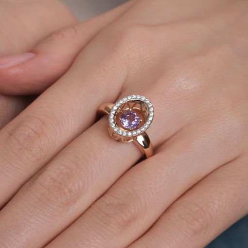 Eleganter Ring aus Rotgold 585 mit einem zarten lavendelfarbenen Amethyst in der Mitte und einer funkelnden Umrandung aus klaren Zirkoniasteinen.