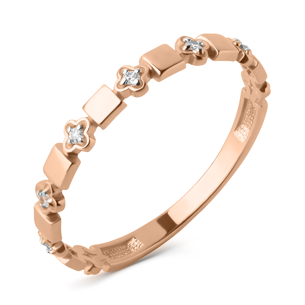 Zarter Damenring aus russischem Rotgold 585 mit einem Wechsel aus glatten geometrischen Elementen und kleinen blütenförmigen Fassungen mit Zirkonia.