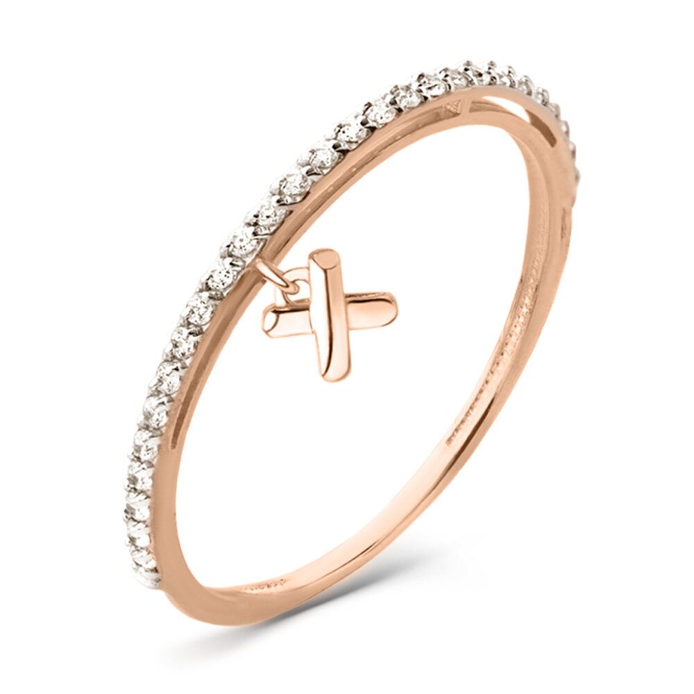 *** Bei Bestellung von Ringgrößen größer als 19,5 mm oder kleiner als 16 mm kontaktiren Sie uns telefonisch. Zarter Damenring aus russischem Rotgold 585 mit einer funkelnden Zirkonia-Reihe und einem kleinen, beweglichen Kreuzanhänger. Ein elegantes Detail, das dem Schmuckstück eine persönliche und moderne Note verleiht.