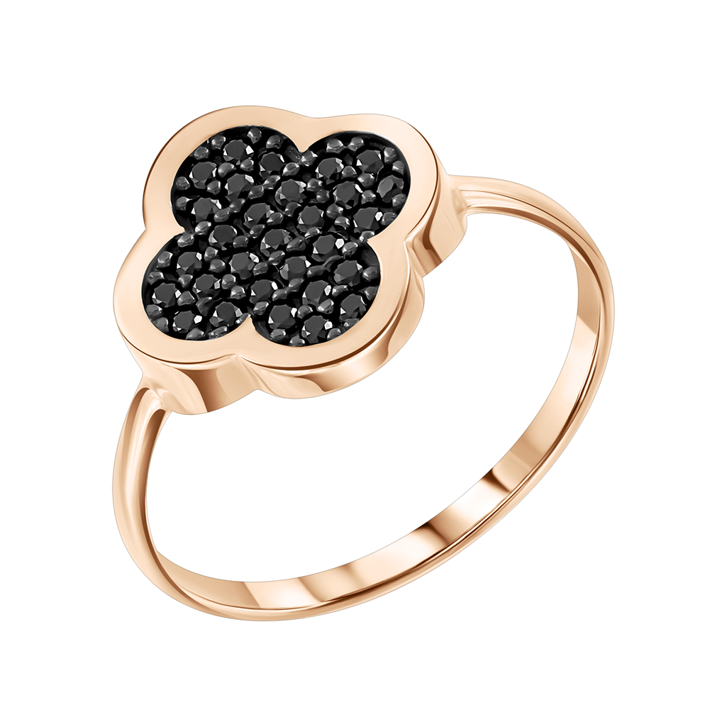 Ring aus Rotgold 585 mit einem filigranen kleeblattförmigen Element, das vollständig mit schwarzen Zirkonia besetzt ist.