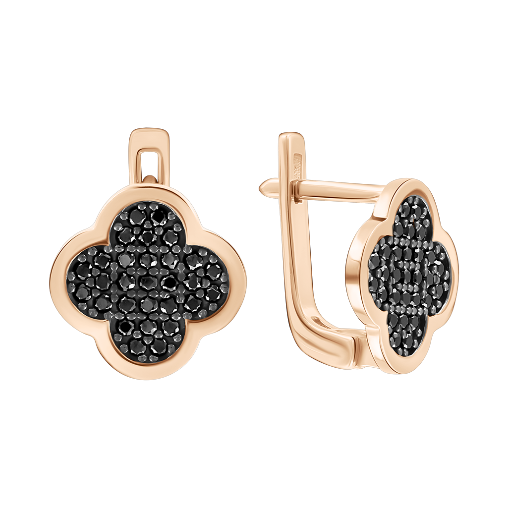 Elegante Ohrringe aus Rotgold 585 mit einem kleeblattförmigen Element, besetzt mit schwarzen Zirkonia.