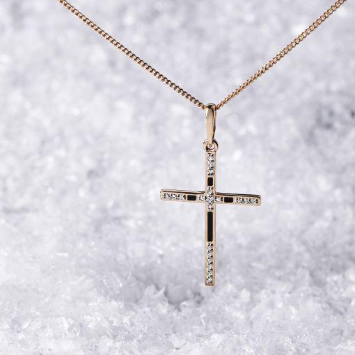 Die feinen Linien des Kreuzes sind mit funkelnden Zirkonia besetzt, die dem Schmuckstück eine elegante, lichtvolle Ausstrahlung verleihen.