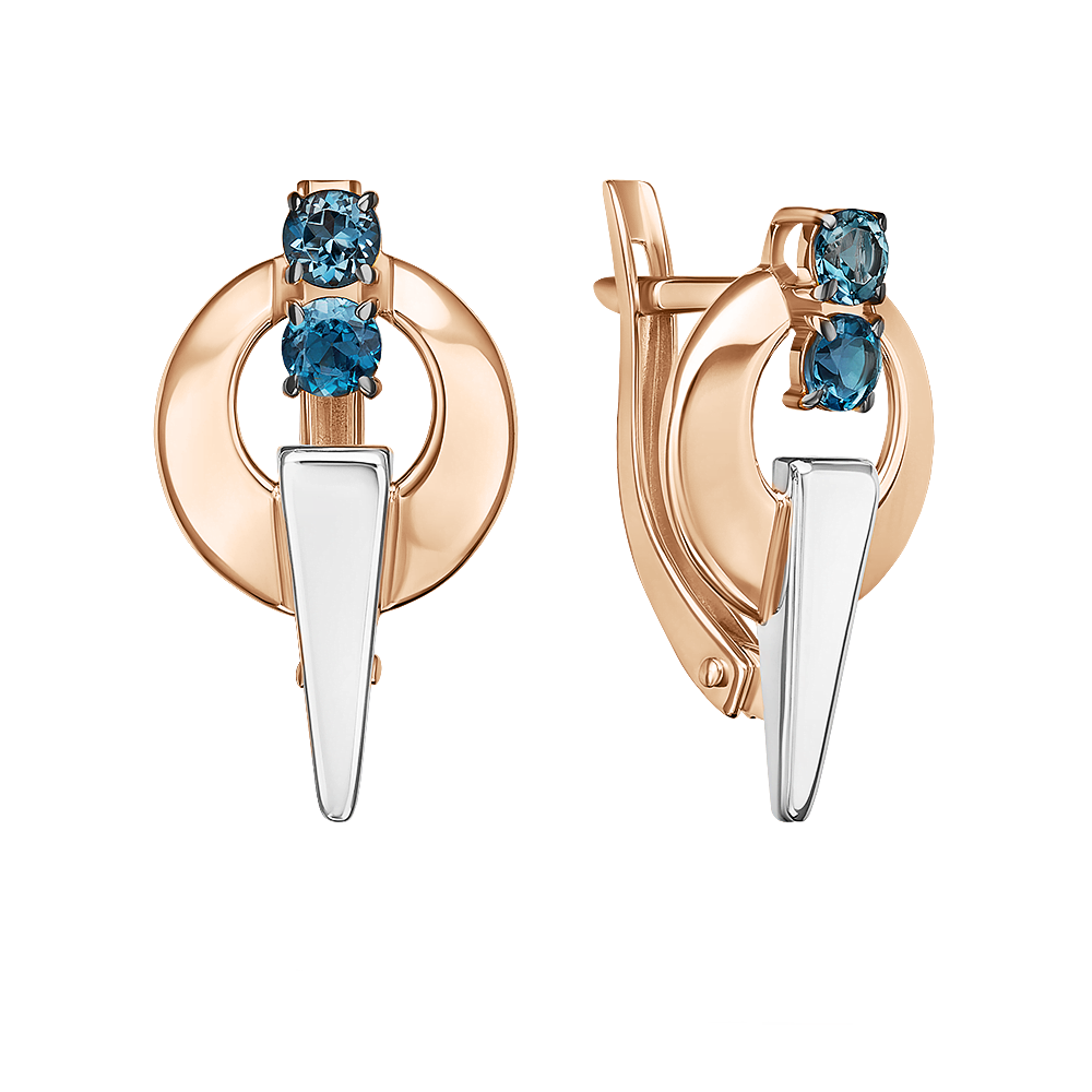 Elegant earrings crafted from 585 Russian red and white gold, adorned with sparkling blue topazes.