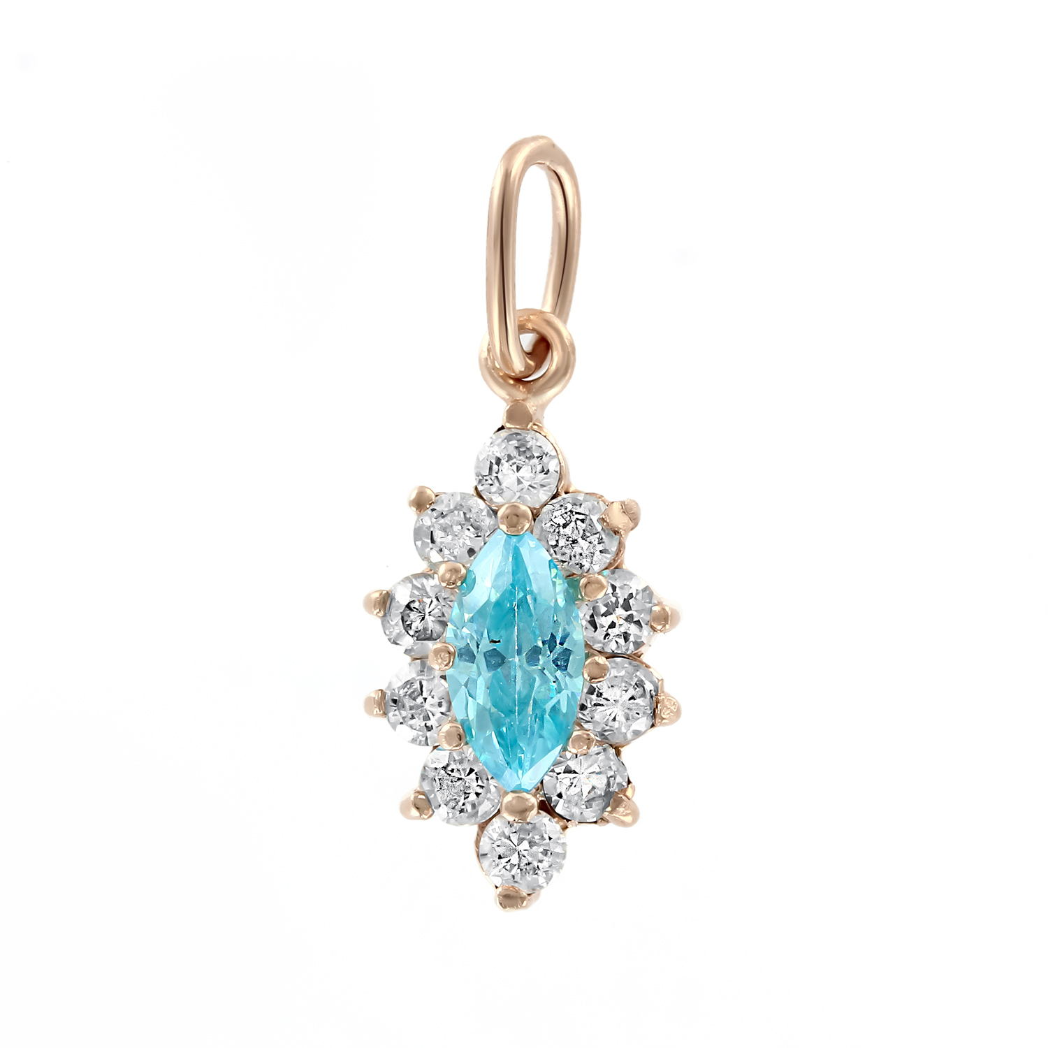 Elegant pendant crafted from 14K red gold, featuring a soft blue topaz at the center, framed by sparkling cubic zirconia.