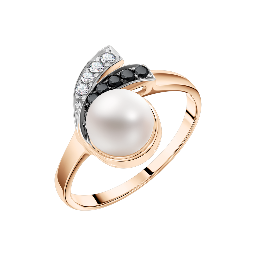 Attractive women's ring, red gold 585, with a natural pearl, zirconia