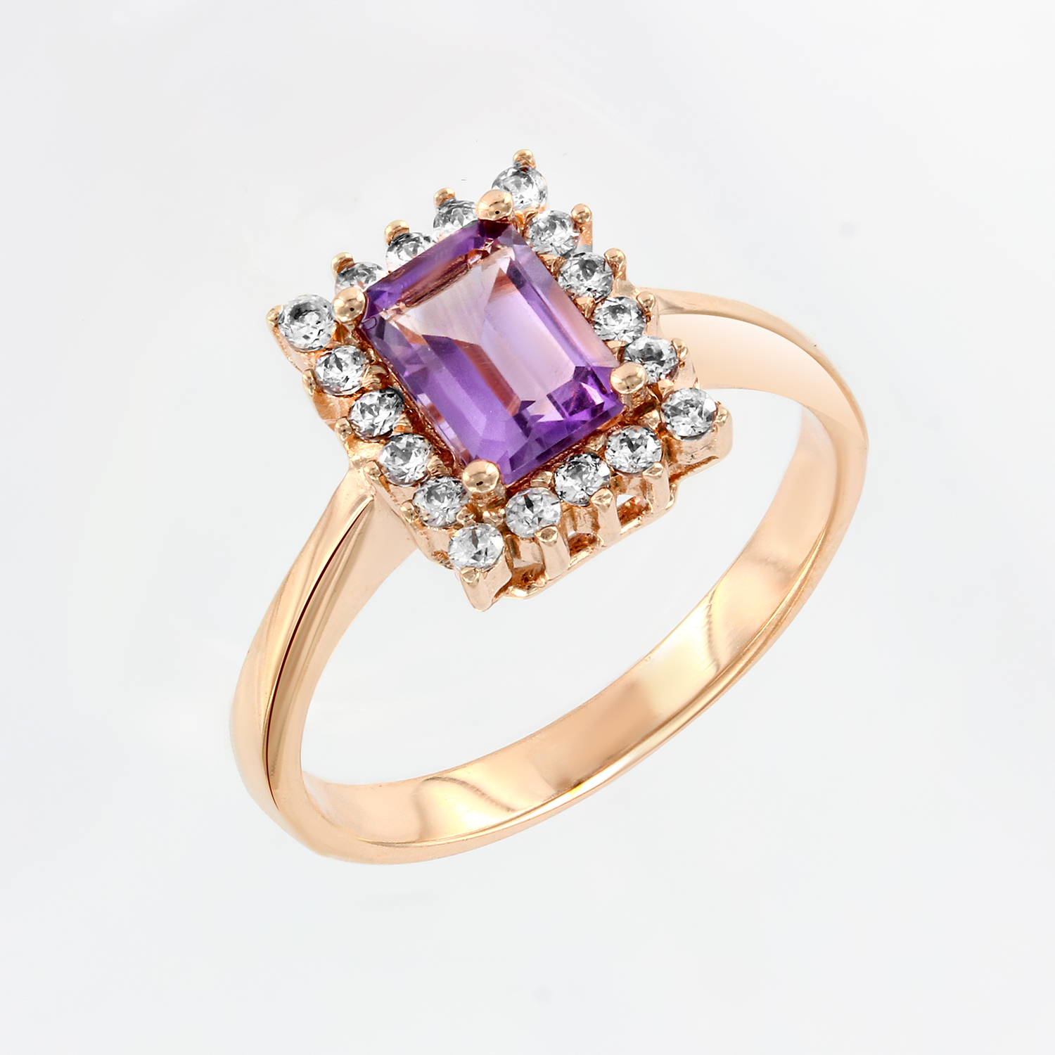 Elegant women's ring crafted from 14K red gold, featuring a rich violet amethyst framed by sparkling cubic zirconia.