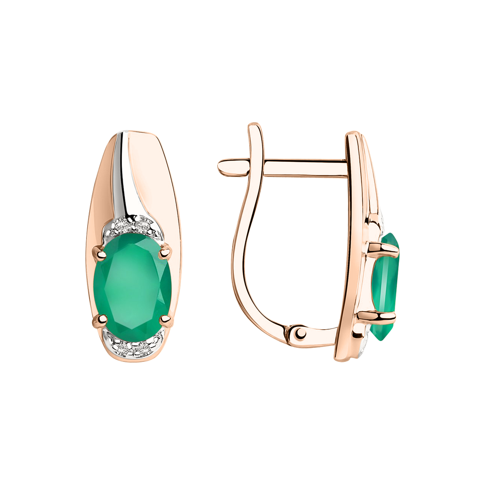 Beautiful earrings, red and white gold 585, with green agate - size approx. 7x5 mm, and 8 cubic zirconia, height approx. 16 mm