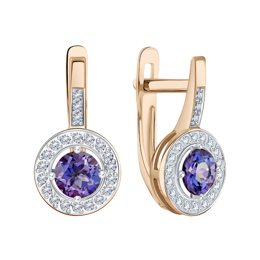 Elegant women’s earrings crafted from 14K (585) red gold with tanzanites and cubic zirconia.