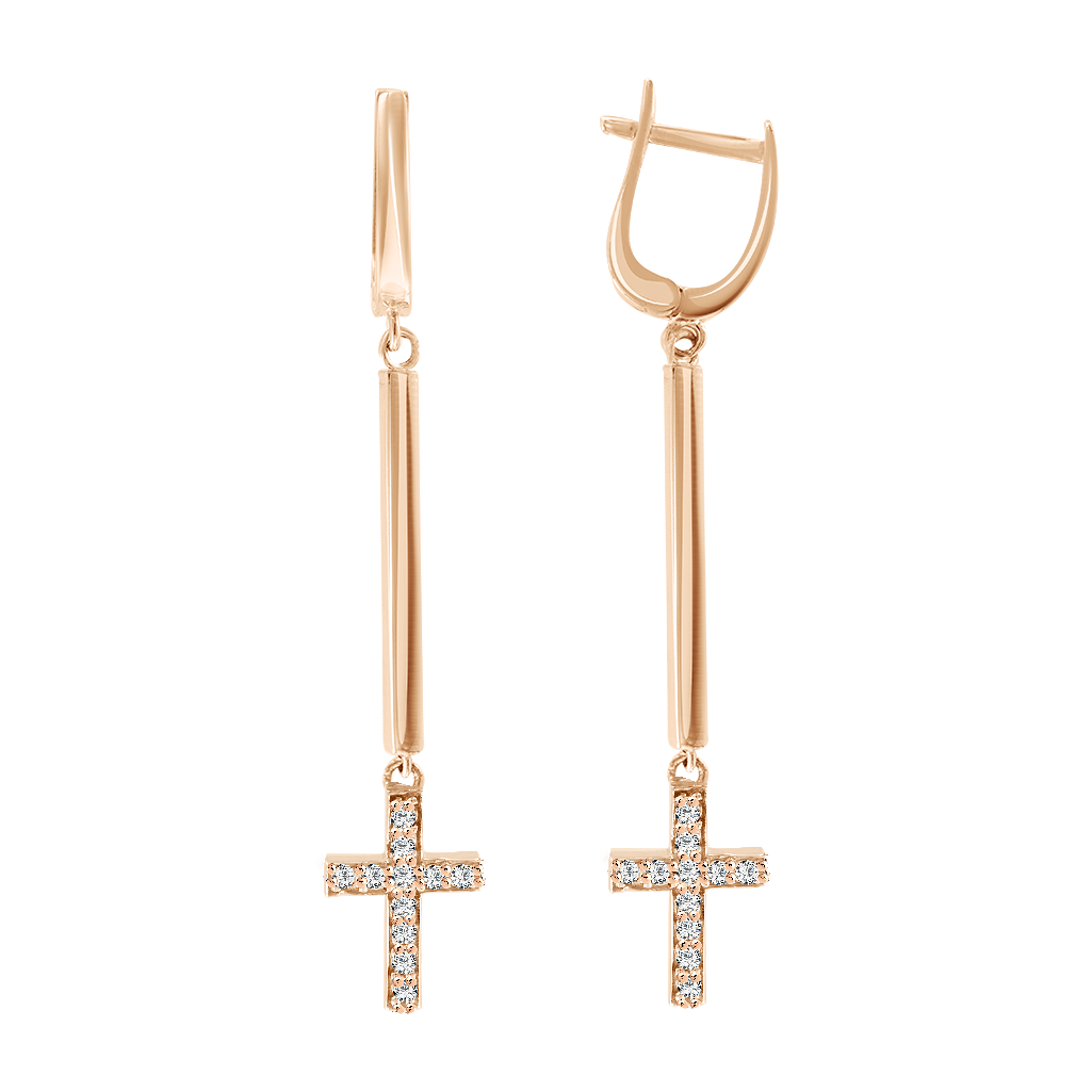 Elongated earrings with crosses, Russian red gold 585, with 22 colorless cubic zirconia, cross length about 13 mm, height about 57 mm