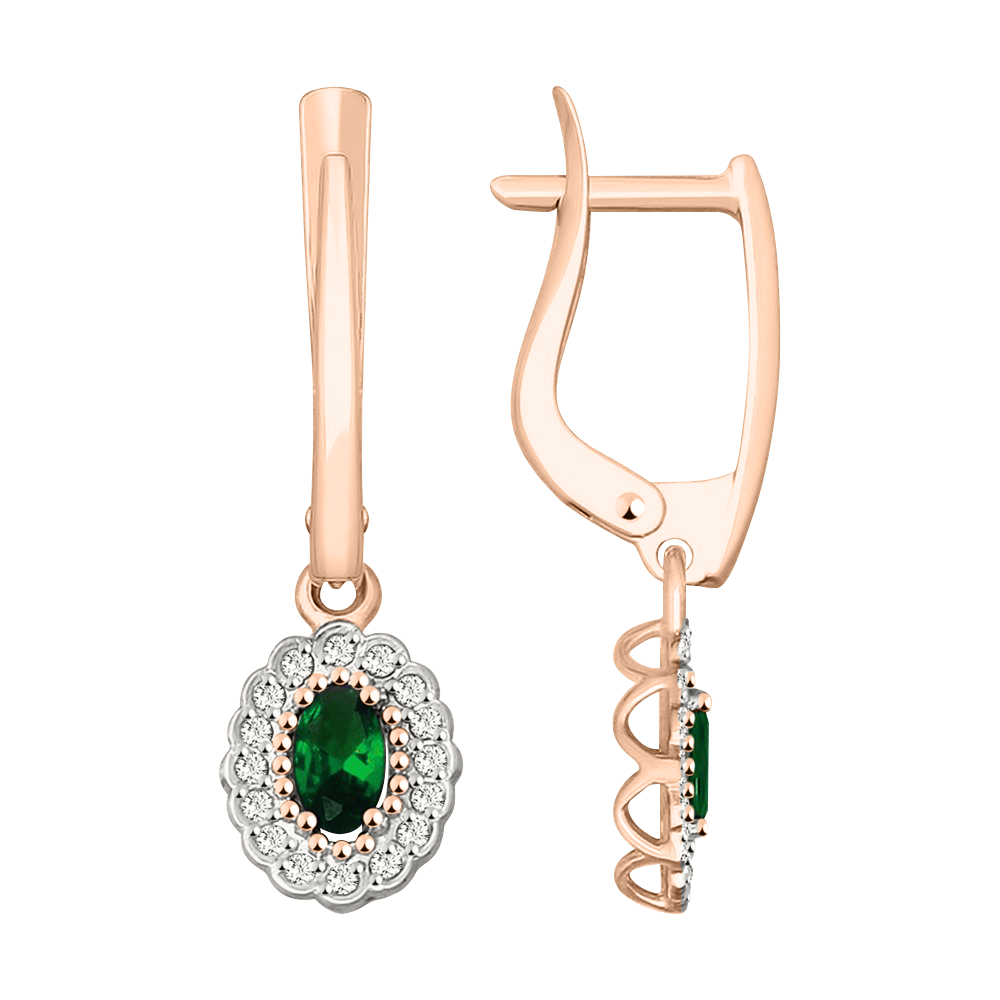 Amazing earrings, red gold 585, with green and white zirconia, height approx. 26 mm