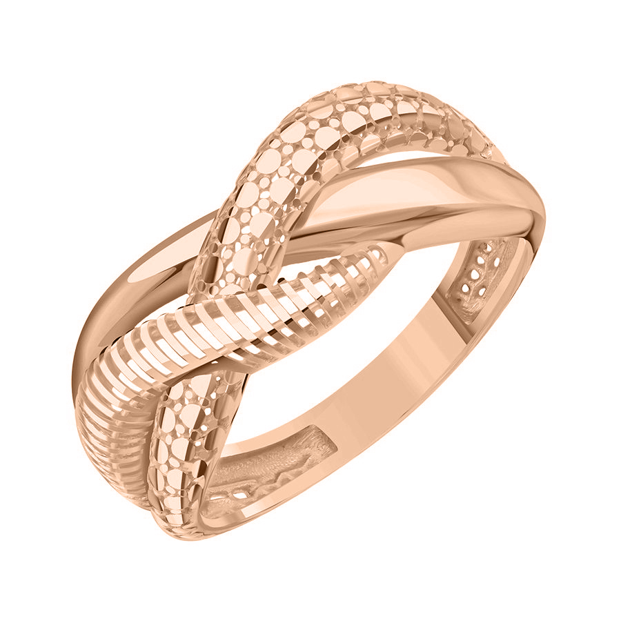 A stylish red gold ring featuring an intricate interwoven relief design that combines smooth and textured elements.