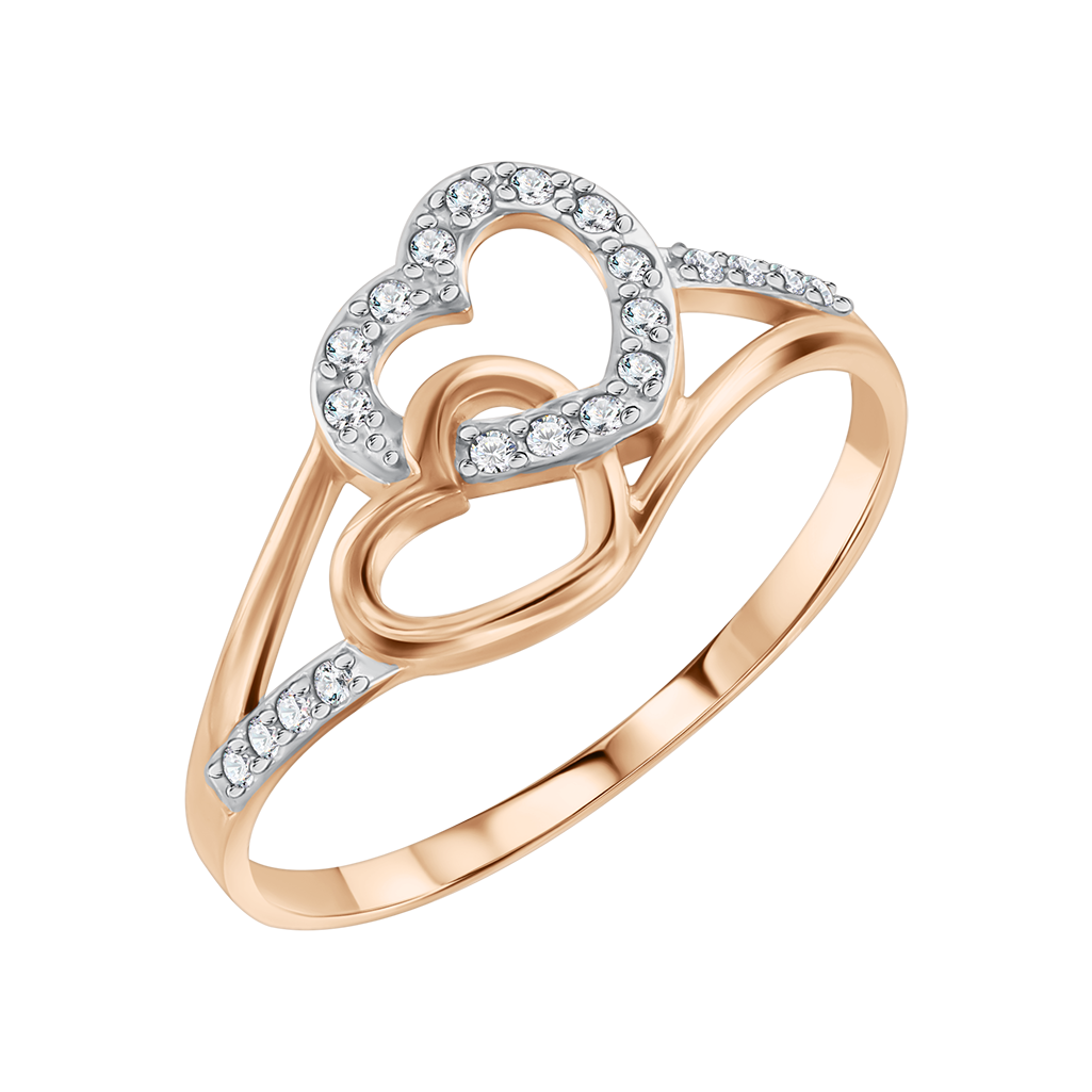 An elegant ring crafted from 585 red gold features a romantic design of intertwined hearts adorned with sparkling zirconia.