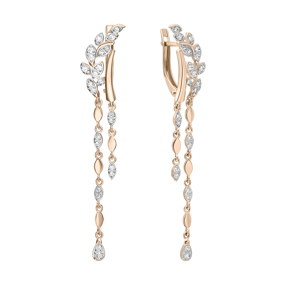 Элегантные серьги из красного золота 585 пробы, украшенные сверкающими фианитами, привлекают внимание выразительным и женственным дизайном. Флористический верхний элемент плавно переходит в длинные подвижные детали, создавая эффектную игру света и ощущение лёгкости при движении. Серьги выглядят изящно, благородно и эффектно, подчёркивая торжественность образа. К ним подобраны подвеска и кольцо, которые вместе образуют гармоничный и стильный комплект.