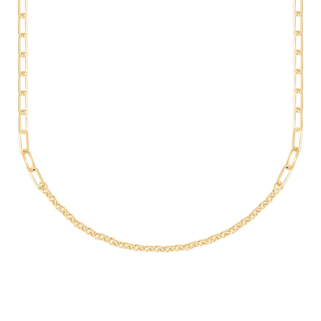 Элегантное колье из жёлтого золота 585 пробы привлекает внимание оригинальным сочетанием разных звеньев цепочки.
