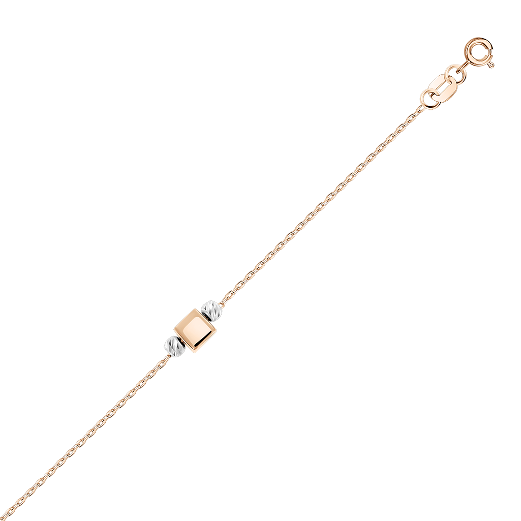Элегантный браслет из русского красного золота 585 пробы — это гармоничное сочетание утончённости и современного минимализма. Его украшает небольшая декоративная композиция из гладкого золотого элемента и двух контрастных белых фасетированных бусин, которые придают украшению лёгкое мерцание и визуальную глубину. Тонкая цепочка смотрится изящно на запястье и подчёркивает утончённый стиль обладательницы. Такой браслет идеально подойдёт для повседневного ношения, легко сочетается с другими украшениями и станет прекрасным подарком для ценителей деликатного, продуманного дизайна.