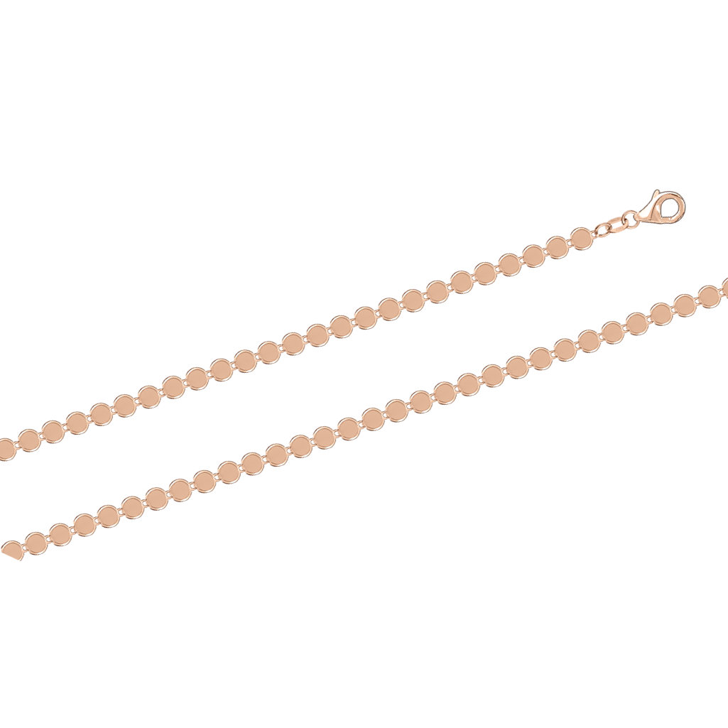Современная цепочка и браслет из красного золота 585 с элементами в виде гладких круглых пластин. Элегантный и необычный дизайн делает комплект стильным акцентом для любого образа. Украшения удобно носить каждый день — они лёгкие, прочные и эффектно смотрятся как самостоятельно, так и в сочетании с подвесками.