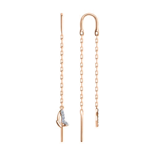 Очаровательные серьги-протяжки из русского красного золота 585 пробы, с вставками по 5 фианитов на каждой, длина спереди ≈ 35 мм, общая длина ≈ 51 мм.