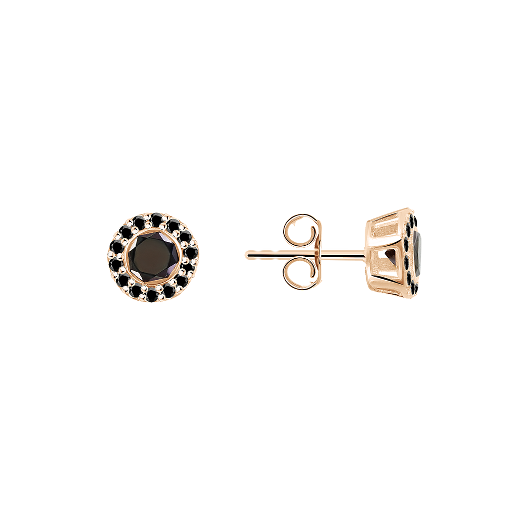 Очаровательные серьги-пуссеты из русского красного золота 585 пробы, с вставками по 15 черных фианитов на каждой, диаметр ≈ 7 мм.