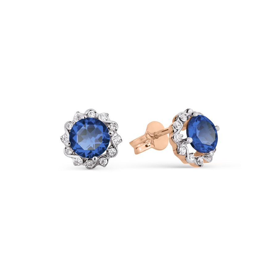 Элегантные серьги‑пуссеты из красного золота 585 выполнены в стиле «halo»: центральный круглый синий сапфир окружён сияющим ободком из мелких кубических фианитов, создающим эффект утончённого цветочного венка.