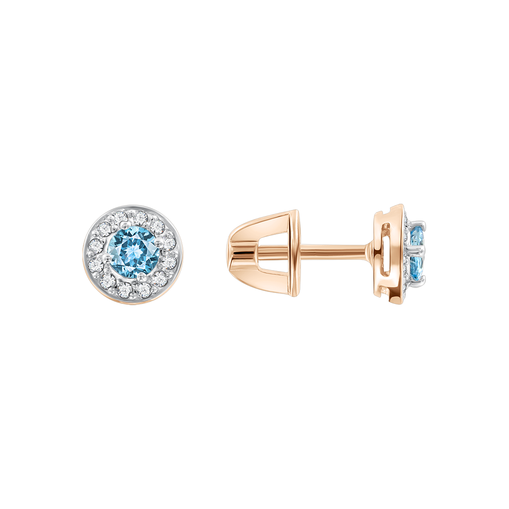 Элегантные серьги-пусеты из красного золота 585 с небесно-голубым топазом в центре и сияющей россыпью фианитов по окружности.