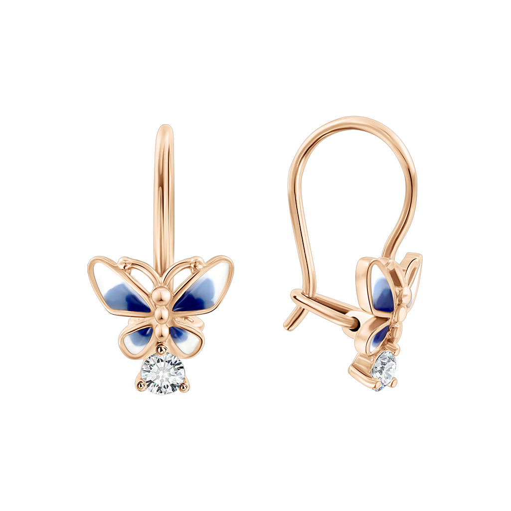 Нежные детские серьги из красного золота 585 с эмалью в виде бабочки и сияющим фианитом.