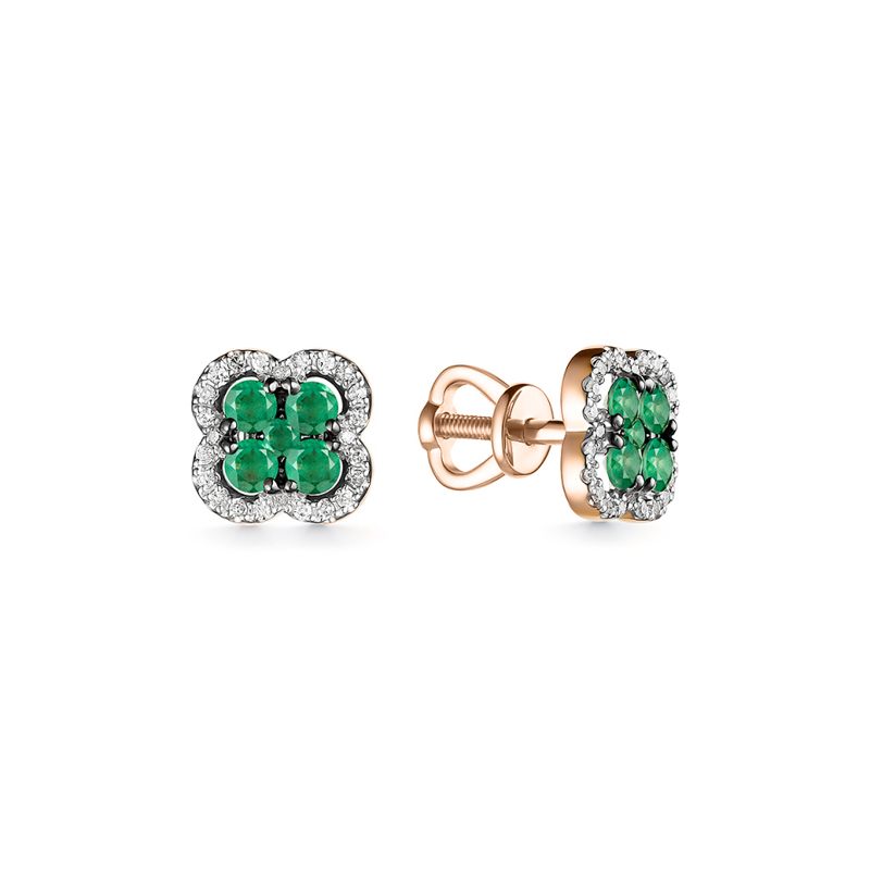 Элегантные серьги-пуссеты, русское красное золото 585 пробы, с изумрудами - весом ≈ 0,507 сt. HTS (10 шт.) и бриллиантами круглой огранки - весом ≈ 0,124 ct. HSI (48 шт.), высота ≈ 8 мм
