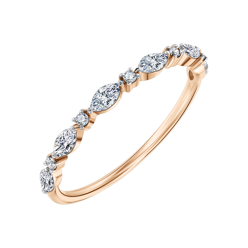 Изысканное кольцо из красного золота 585 пробы украшено сияющими бриллиантами, чередующимися в утончённой композиции.