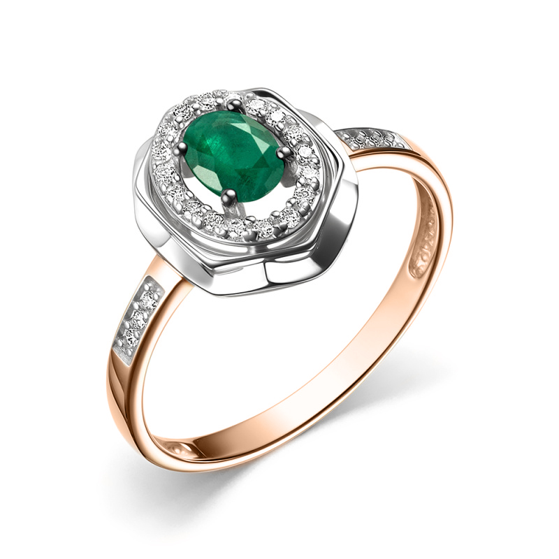 Центр композиции — яркий овальный изумруд, обрамлённый сияющими бриллиантами, которые подчёркивают глубину цвета и благородство камня.
