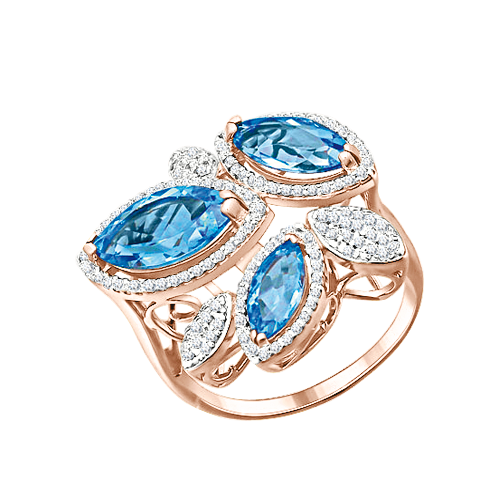 Изумительное кольцо из красного золота 585 пробы, инкрустированное тремя Голубыми топазами и фианитами. Красоту топазам насыщенного, нежного цвета, расположенных в центральной части украшения, придает особая огранка. Вставки из фианитов на покрытии из белого золота, придают украшению яркости. Умелая работа ювелиров, соединивших благородное мерцание красного золота, завораживающую синеву топазов и сияние фианитов, привнесет в ваш образ изысканности и шарма. К этому кольцу есть серьги.