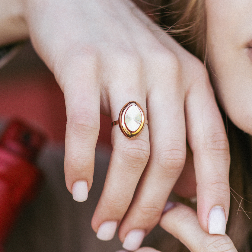 Это кольцо из красного золота с родированным элементом очаровывает выразительной формой, тонким блеском и стильным ретро-шармом.