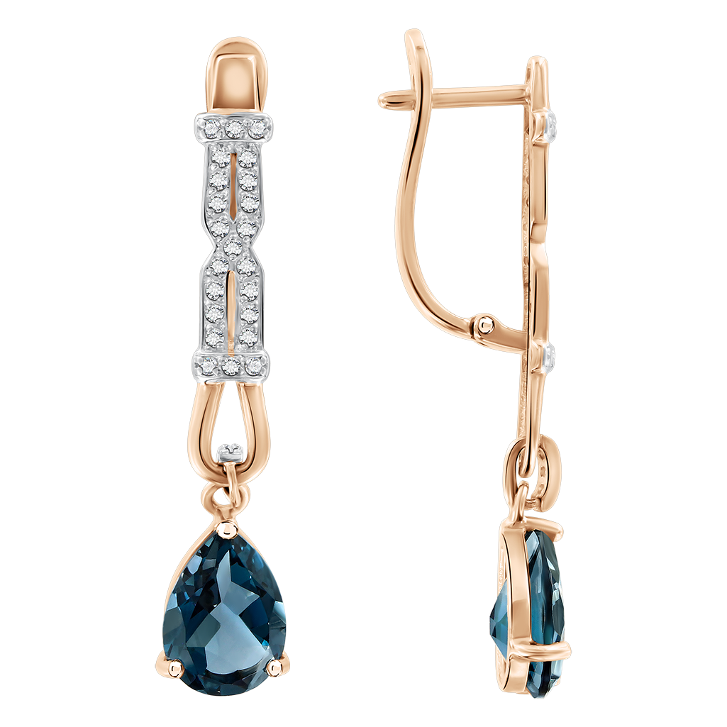 Великолепные серьги из русского красного золота 585 пробы украшены каплевидными лондон-топазами размером ≈ 10x7 мм и сияющими фианитами.