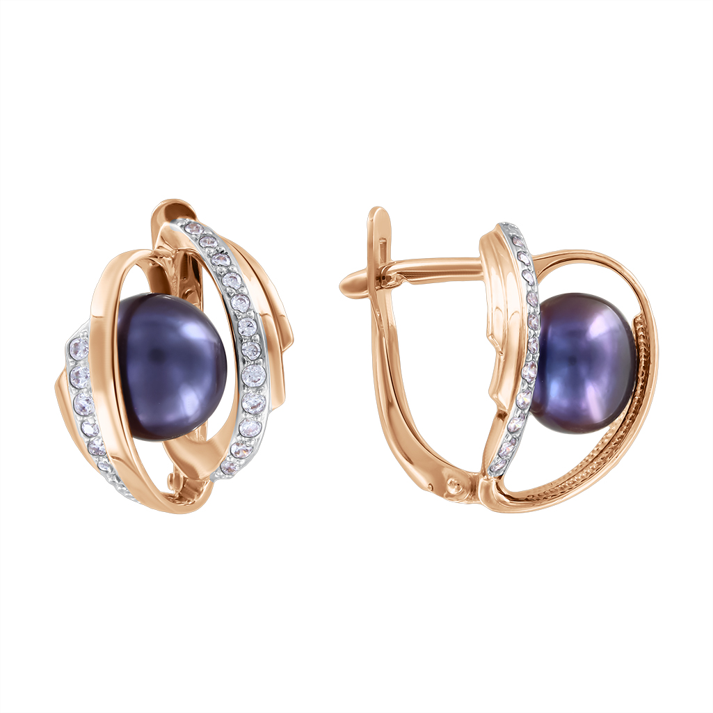 Элегантный комплект с тёмной жемчужиной и сияющими фианитами в золотом обрамлении.