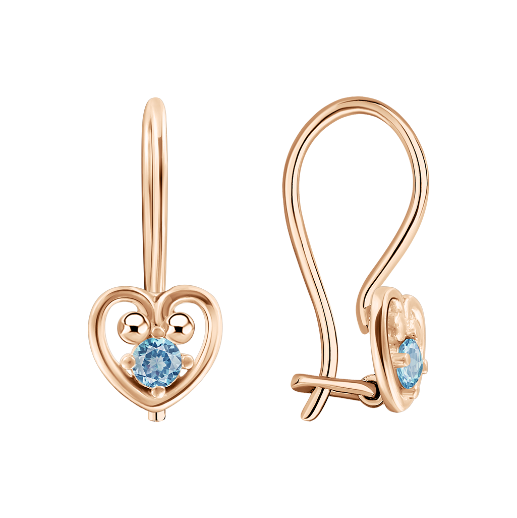 Нежные серьги из красного золота 585 пробы выполнены в форме сердца и украшены голубым фианитом. Изящный дизайн придаёт украшению лёгкость и романтичный характер. Благодаря аккуратному размеру и удобной застёжке серьги прекрасно подходят как для женщин, так и для детей.