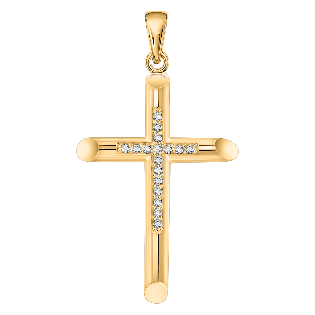 Элегантный крестик из благородного жёлтого золота украшен сияющими фианитами, которые формируют аккуратное сверкающее крестовое очертание. Скруглённые окончания и чистые линии придают украшению современный, но в то же время классический характер. Стильный символ веры и гармонии.