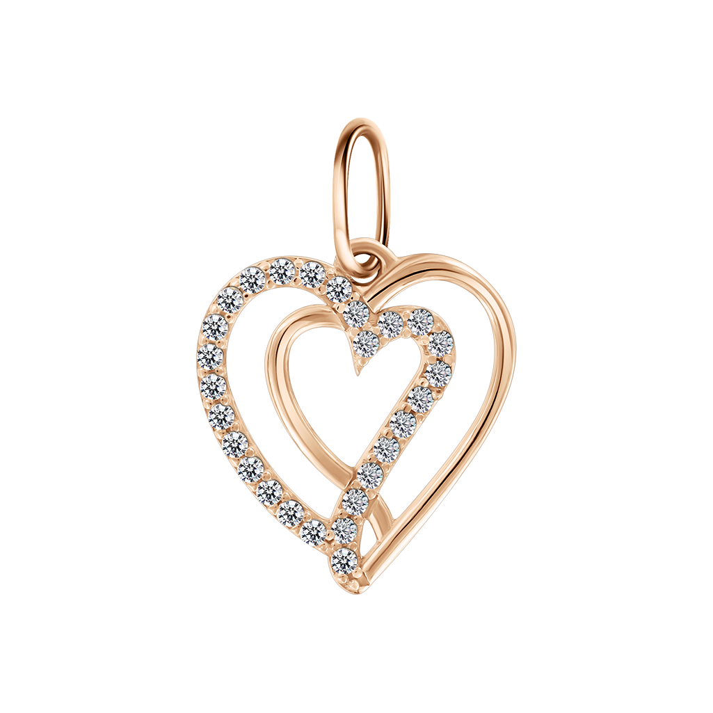Элегантная подвеска из красного золота 585 пробы выполнена в форме двойного сердца и украшена сверкающими фианитами.