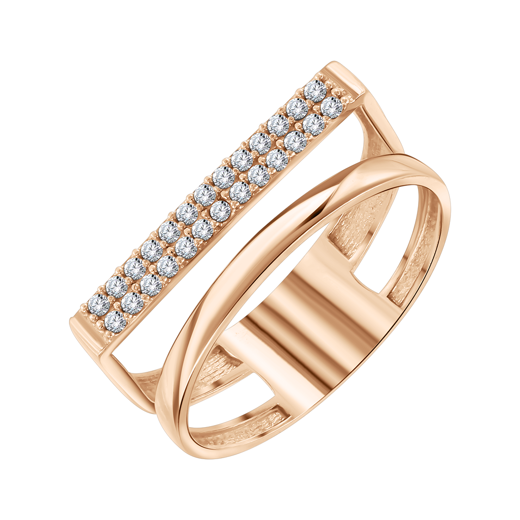 Стильное кольцо из красного золота 585 пробы украшено дорожкой из сверкающих фианитов.