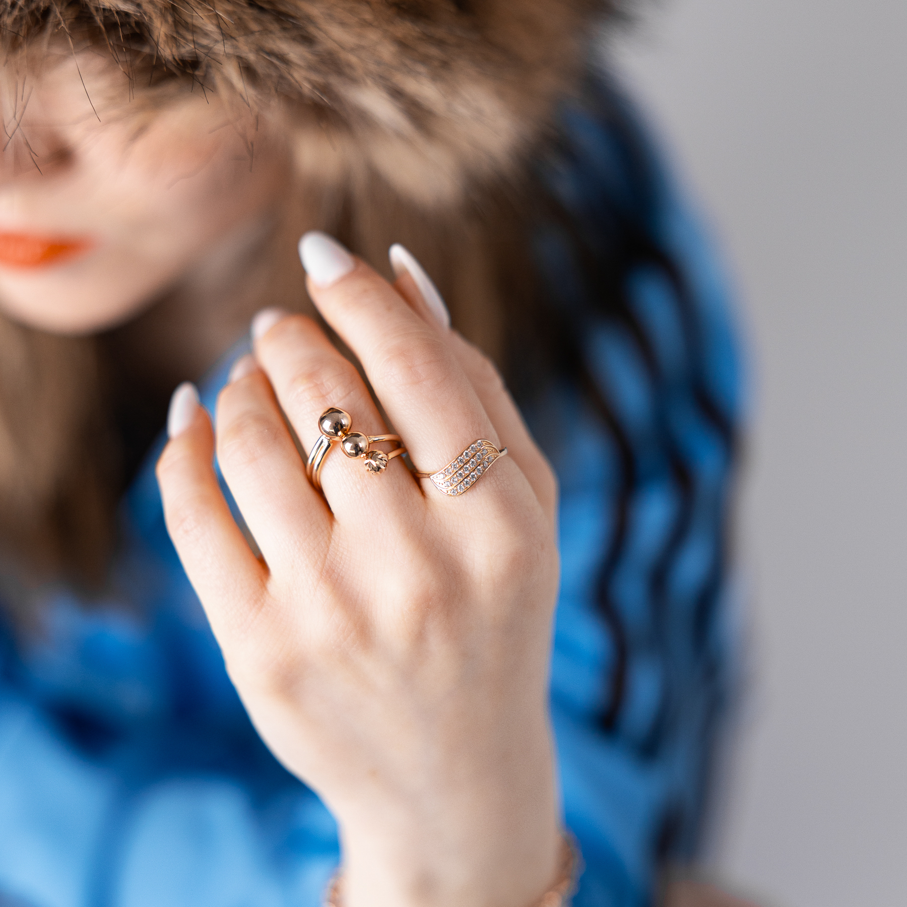 *** Если вы заказываете кольца размером больше 19,5 мм или меньше 16 мм, свяжитесь с нами по телефону. Элегантное кольцо из красного золота с открытым дизайном и выразительными сферическими акцентами. Современное украшение с утончённым характером для стильного образа.